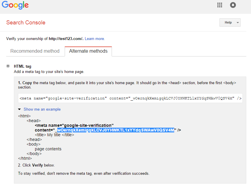 Select “Alternate Methods” and click on the HTML tag option. A meta tag will appear right under it. You can